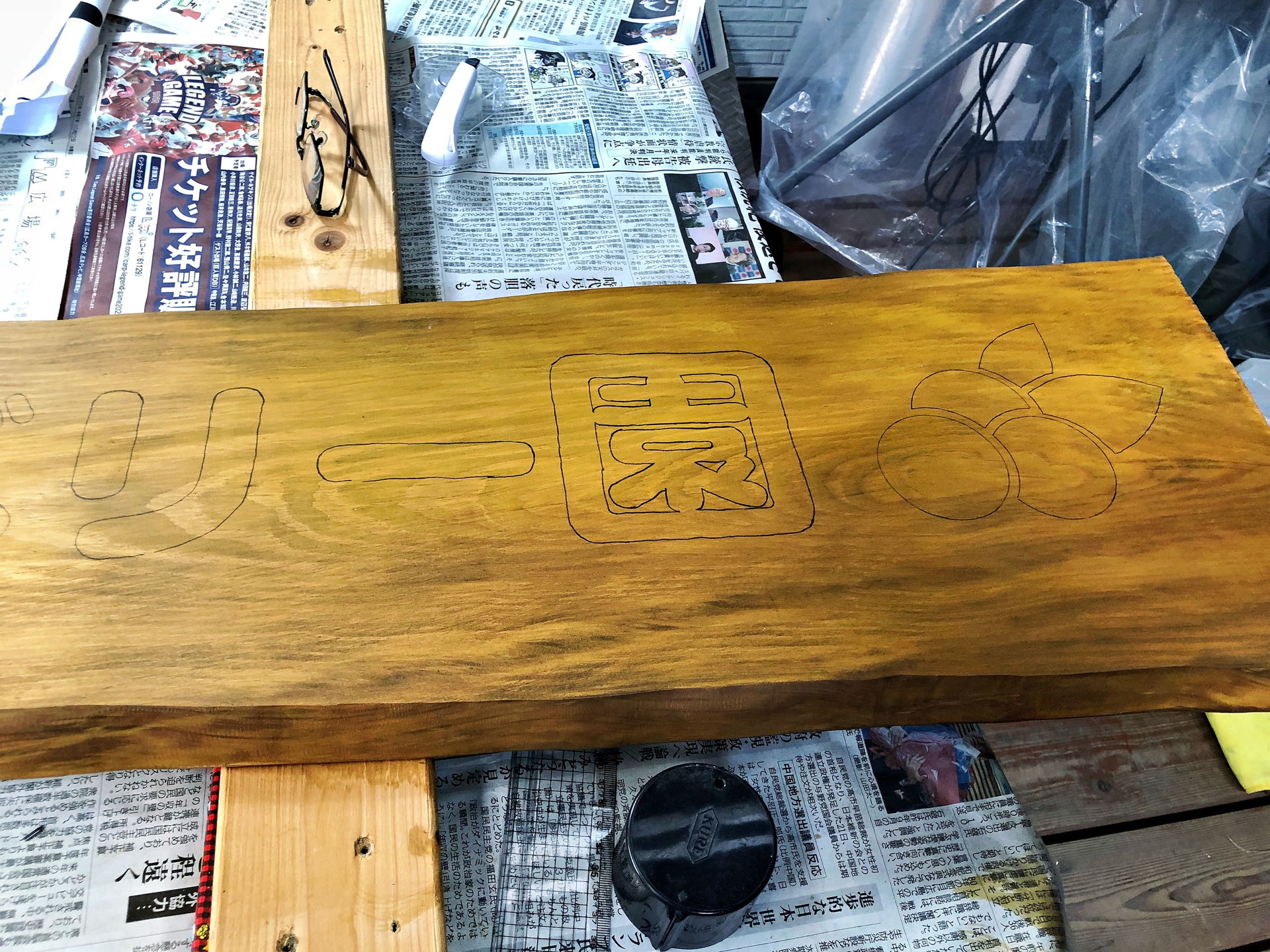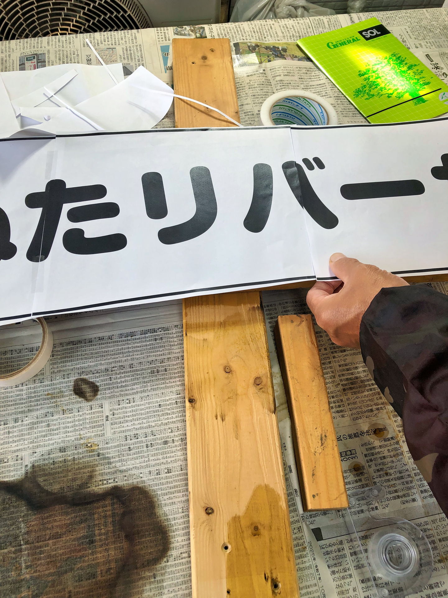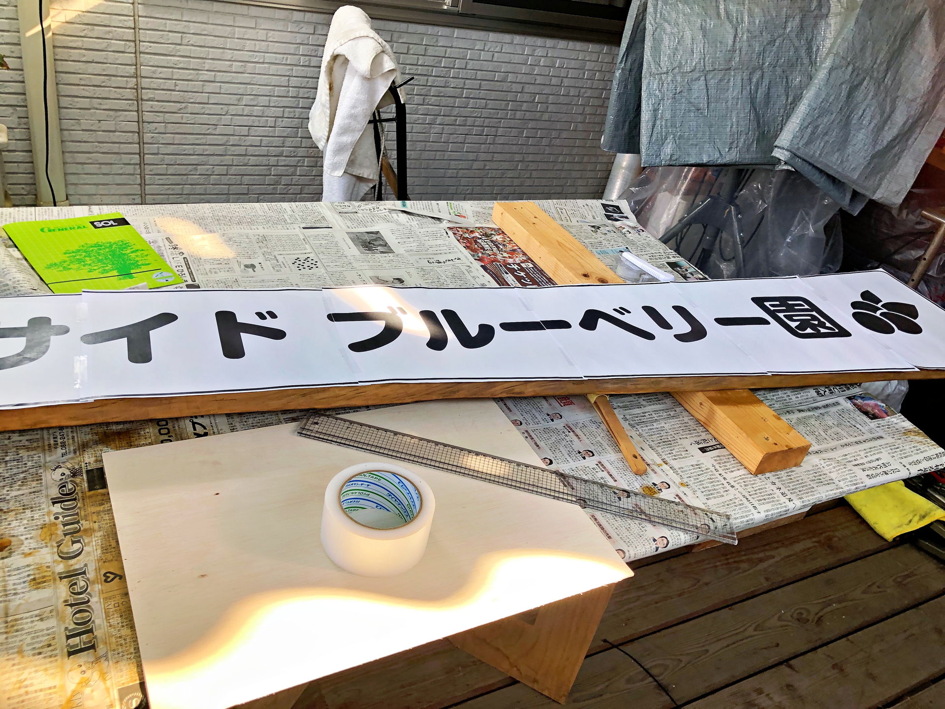 横に長い看板なので、パソコンで作成したデザインをA4紙 9枚に印刷しそれらを貼り合わせ、板との間にカーボン紙を挟み、一文字ずつ写していきました。