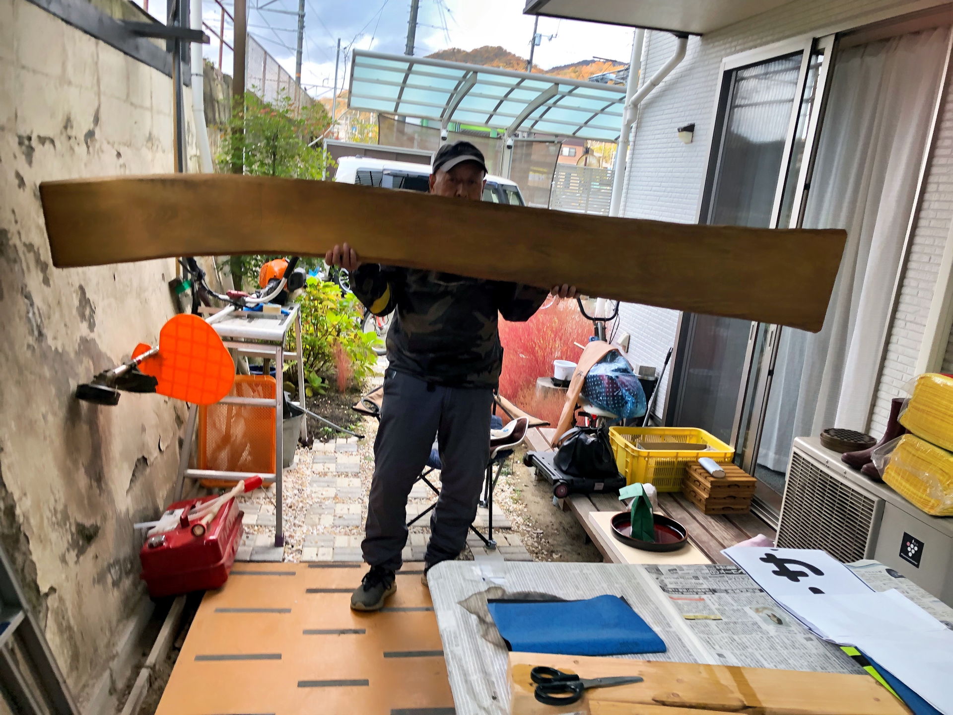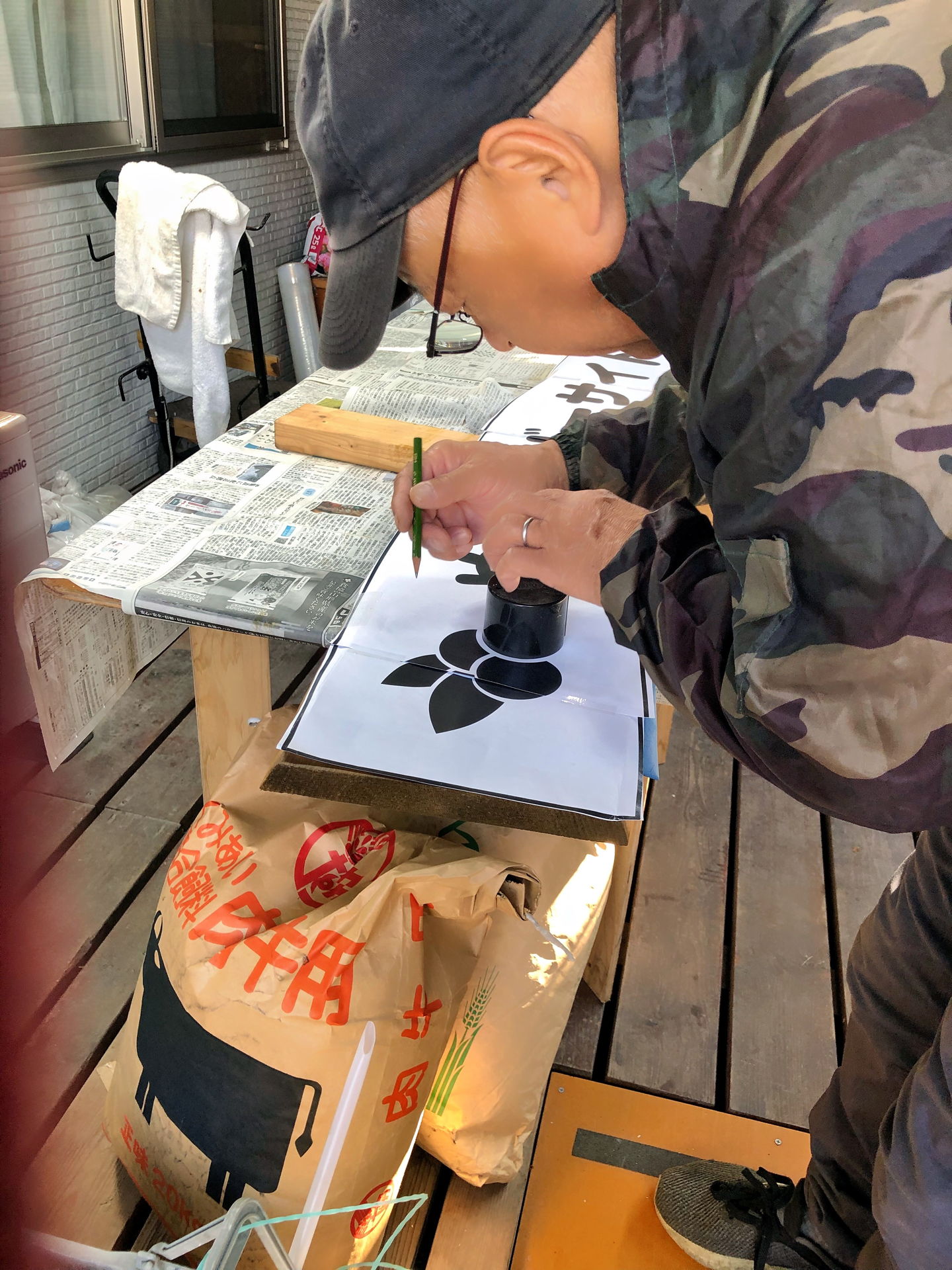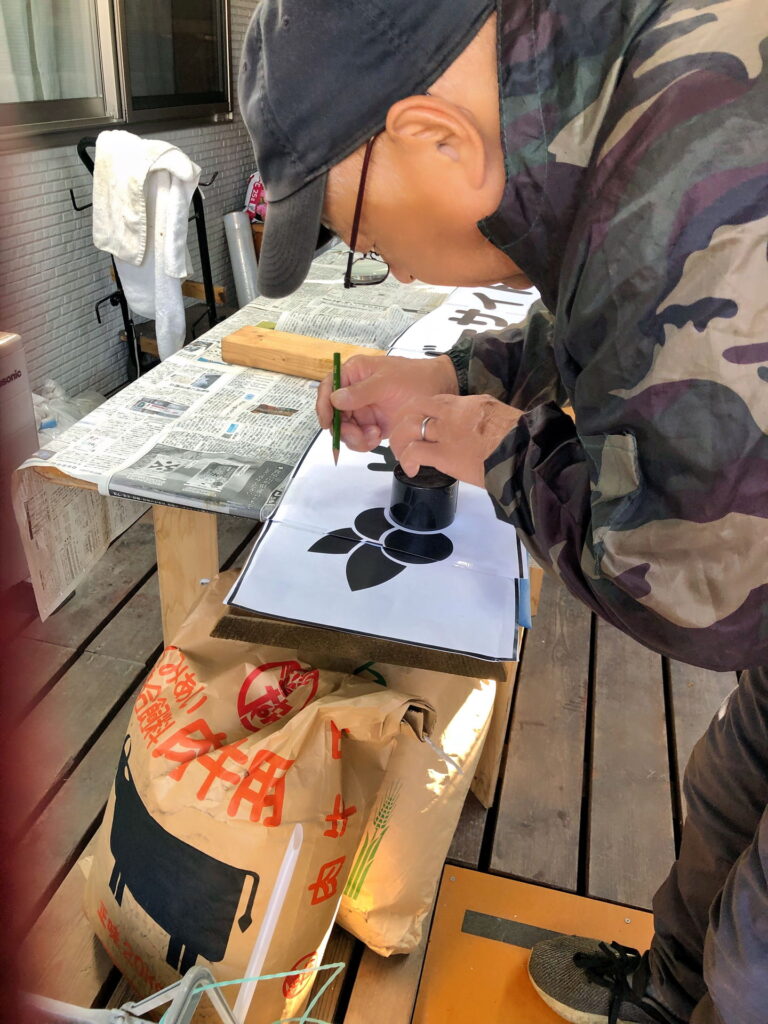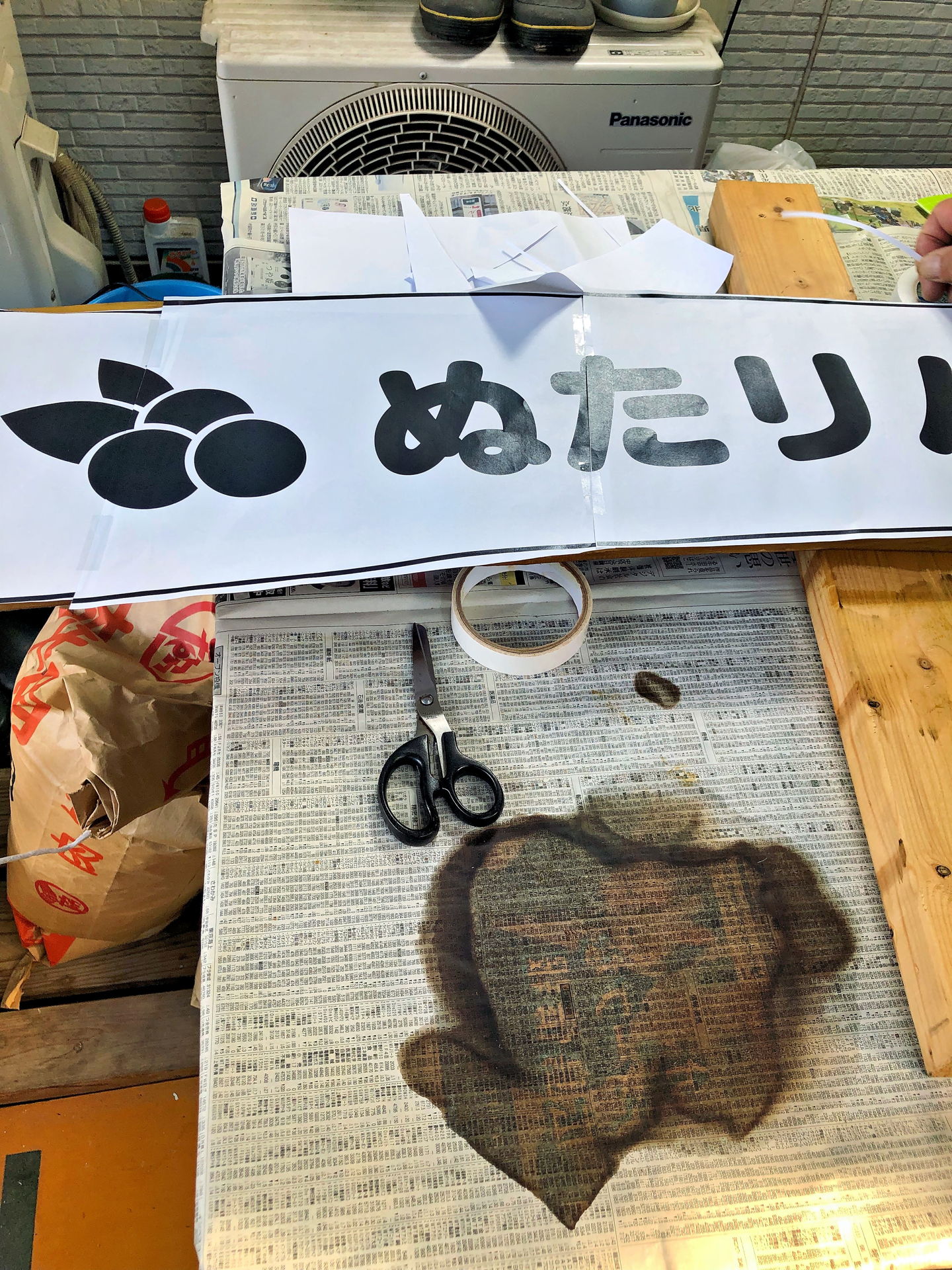 横に長い看板なので、パソコンで作成したデザインをA4紙 9枚に印刷しそれらを貼り合わせ、板との間にカーボン紙を挟み、一文字ずつ写していきました。